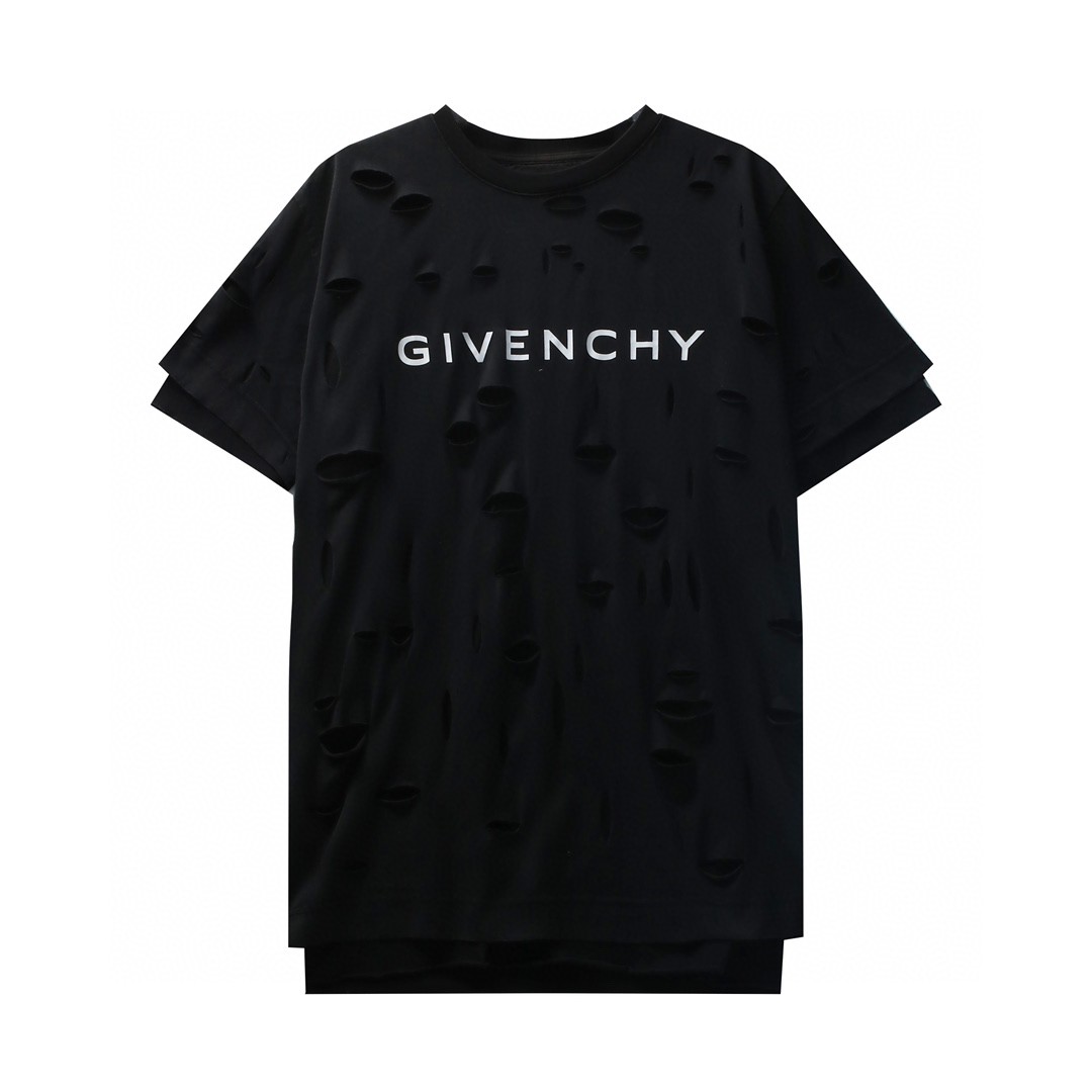 Givenchy 纪梵希 破洞假两件字母logo印花 T恤 短袖 套头 夏款 黑色 BM71G13Y9W-011