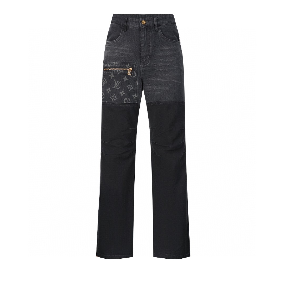 LOUIS VUITTON 路易威登 印花拉链口袋拼接牛仔裤 做旧 裤子 长裤 黑色 1AFACQ