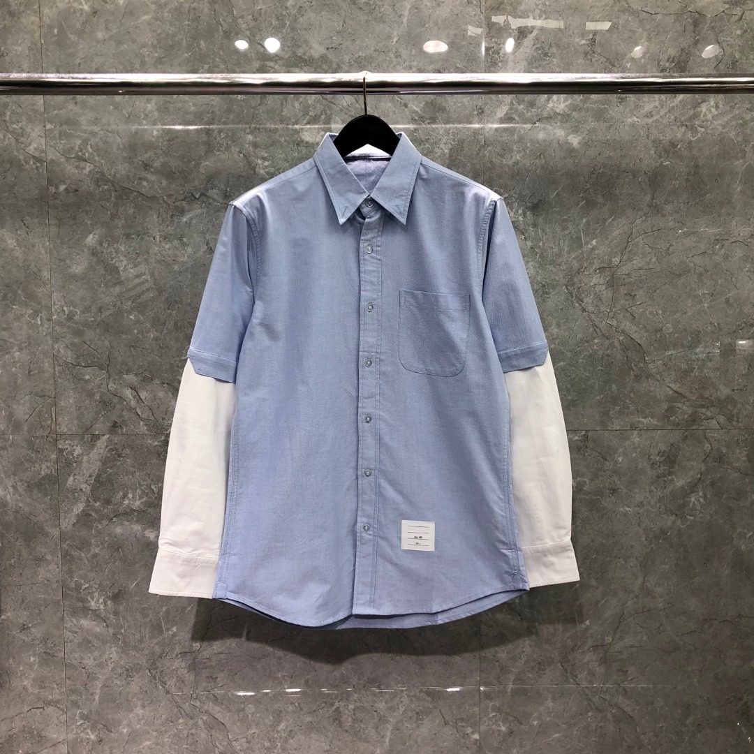 THOM BROWNE 袖子拼接翻领单排扣衬衫 外套 长袖 蓝色 MWL409C-F0313-480