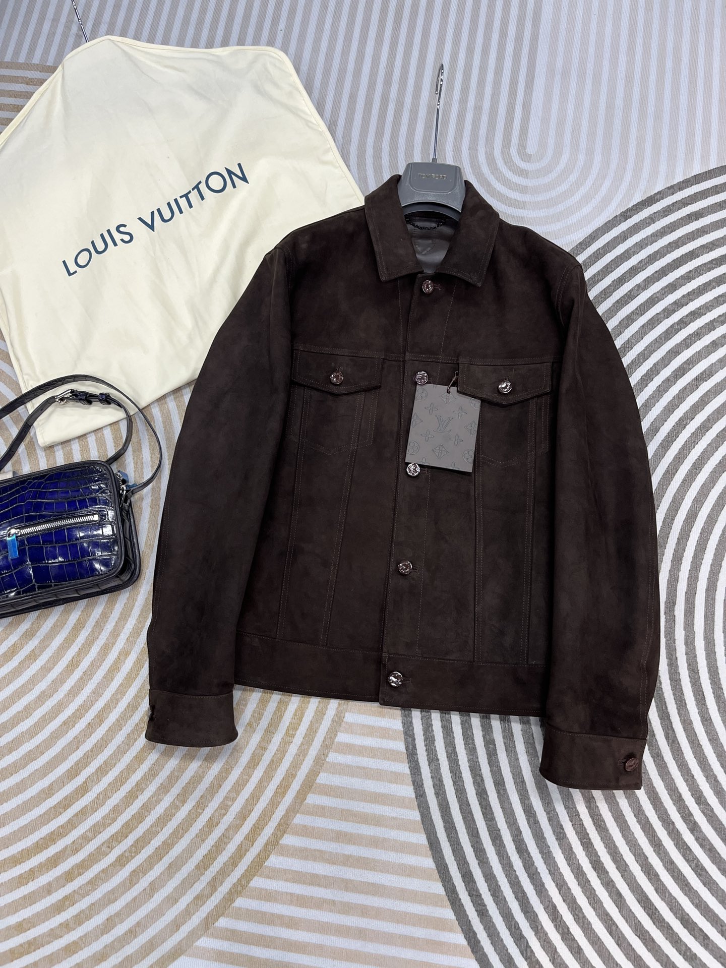 高定系列 LOUIS VUITTON Suede Denim Jacket LV 纯色尖领纽扣压花带盖口袋长袖夹克外 套 男款 棕色 1AF589 AG2035