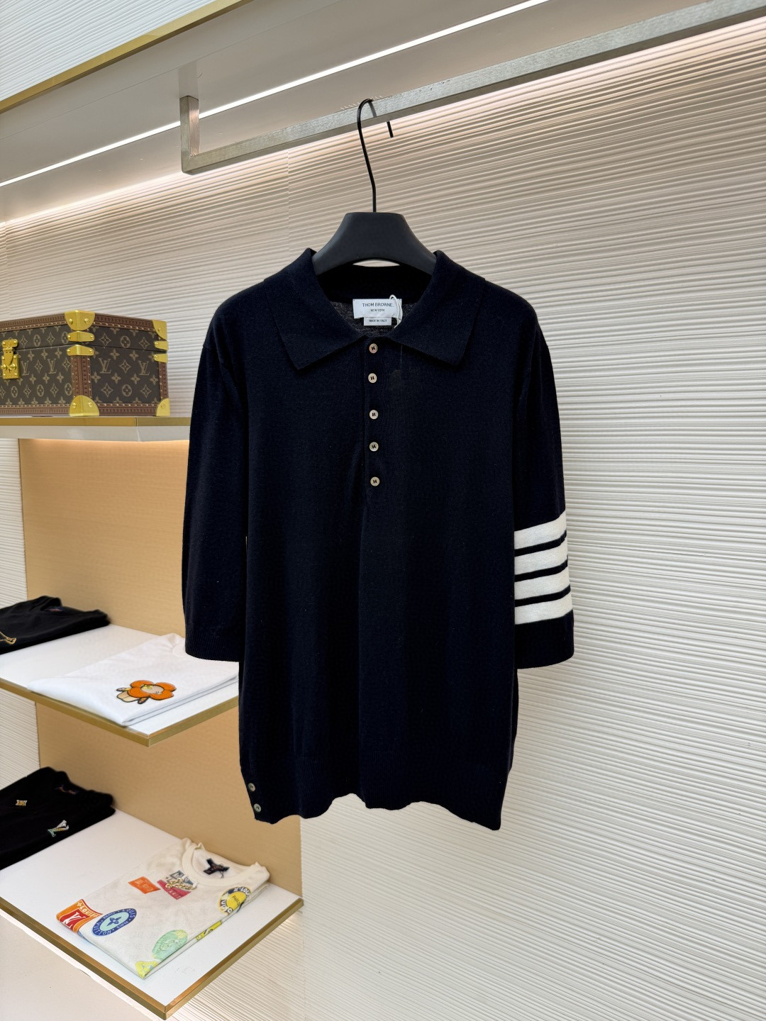 THOM BROWNE 羊毛针织七分袖Polo衫 短袖 女款 藏蓝色 杏色 灰色 B0 FKP053A-Y1014-415