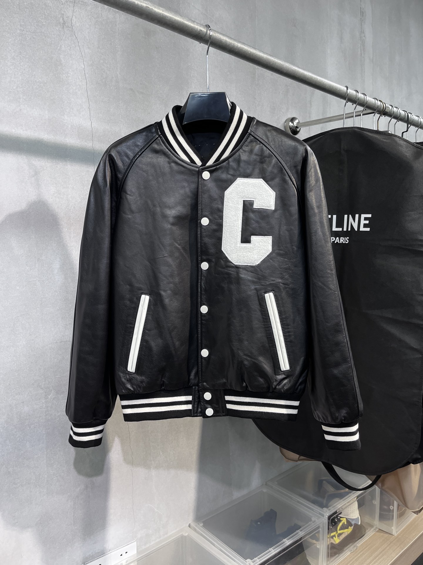 CELINE 赛琳 SS23 大C字母 Logo 条纹 单排扣 学院风 棒球服 宽松 长袖 外套 头层牛皮 皮衣 黑色 2EC24132O-38NI