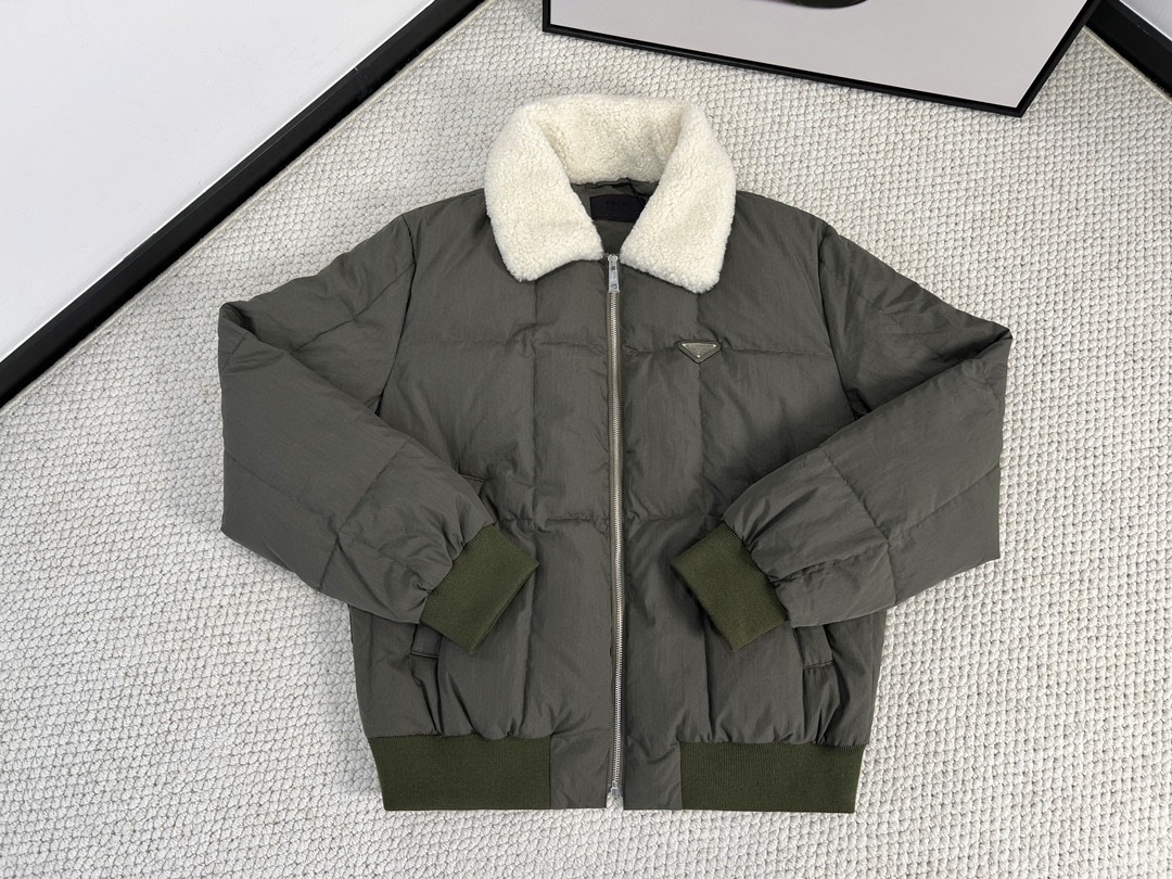 PRADA 普拉达 纯色Logo贴标 羊羔毛翻领羽绒服 夹克 外套 长袖 绿色 SGC409-1P4Q-F0414-S-232