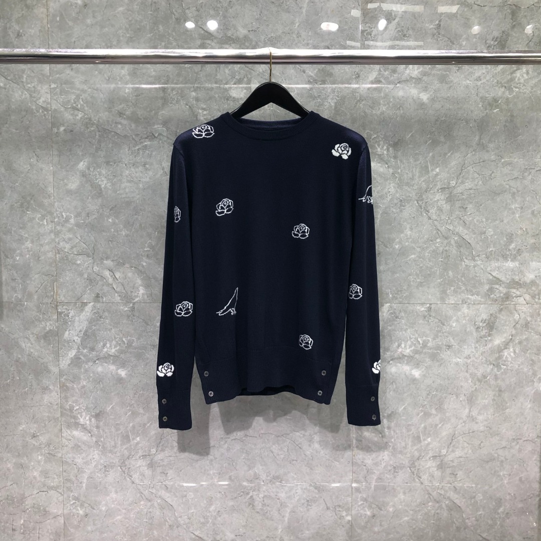 THOM BROWNE 玫瑰小鸟图案羊毛圆领毛衣 针织衫 长袖 藏青色