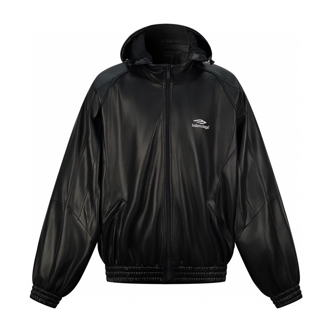 Balenciaga 巴黎世家 SS23 字母刺绣Logo 连帽夹克 皮衣 宽松 外套 秋冬款 黑色 697771TMS021000