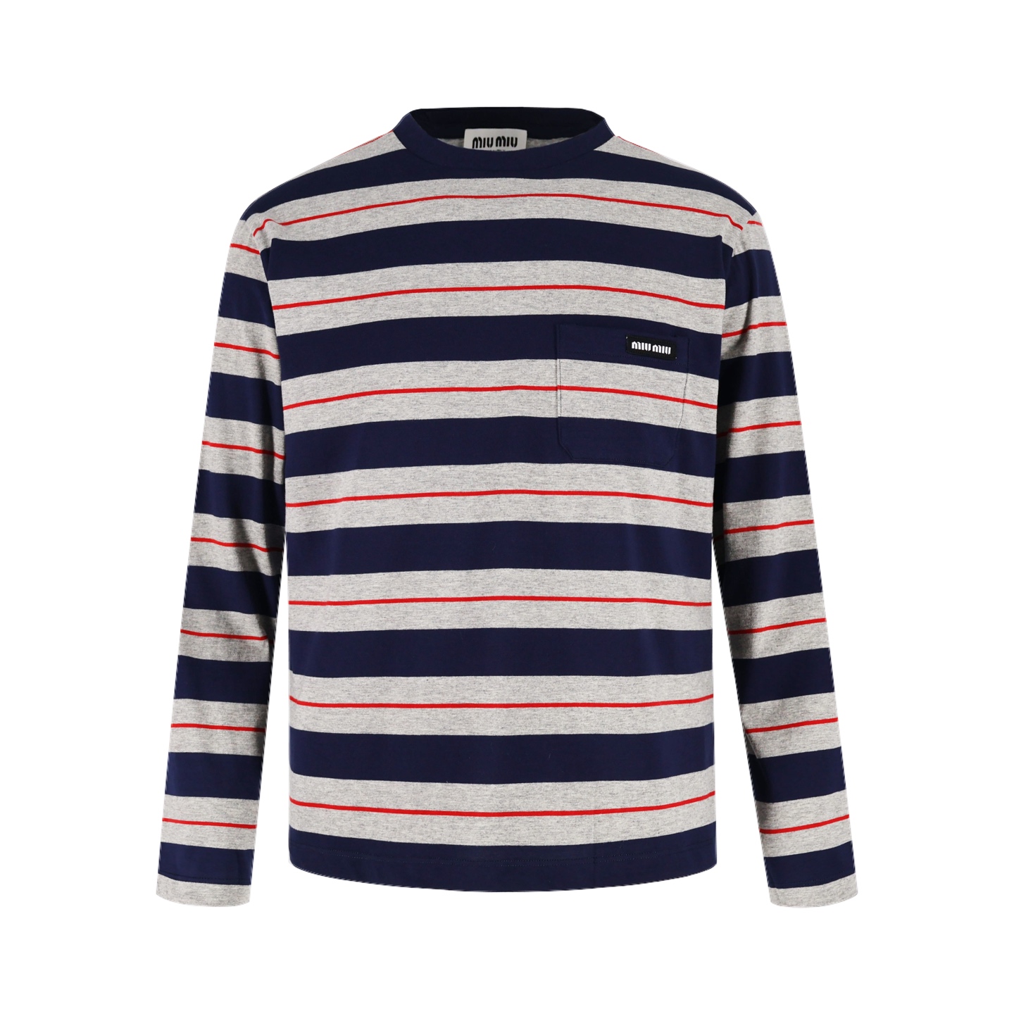 MIU MIU 缪缪 条纹口袋贴标T恤 打底衫 长袖 海军蓝 A5 MJL014-14RT-F0S5G-S-OOO